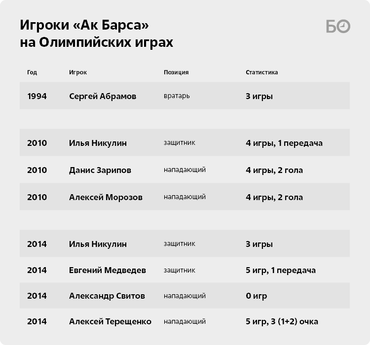Хотя «Ак Барс» из сезона в сезон претендует на высокие места, игроков казанской команды в олимпийскую сборную России вызывали не так часто. Всего в истории «барсы» выступали на трёх Олимпиадах, а в XXI веке – на двух. Мы решили вспомнить обо всех российских хоккеистов «Ак Барса» на играх.