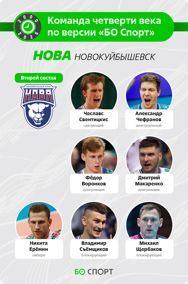 Никита Ерёмин (2019/20, 2022–2025). Все последние сезоны «Новы» в суперлиге не обходятся без Ерёмина. Два года отсутствия команды в элите либеро переждал в «Белогорье» и «Газпром-Югре». Интересно, что процент его приёма три года кряду стремительно растёт – 46% – 49% – 52%. Такими темпами 34-летний волейболист скоро станет лучшим принимающим чемпионата.