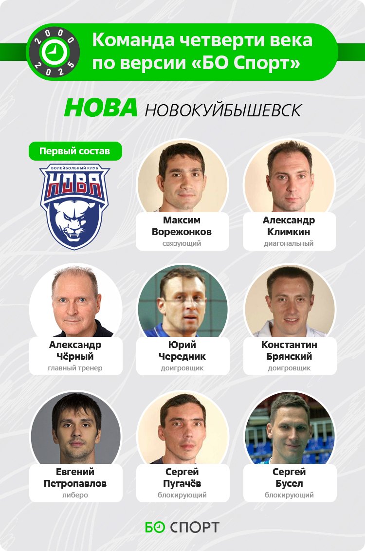 Сергей Пугачёв (1994–2009). Блокирующий прошёл с командой весь путь – от самых низов до элиты российского волейбола. Он был верен «Нове» практически всю карьеру, которую начал в самарском «Автомобилисте» (1992–1994). Пугачёв повесил кроссовки на гвоздь в 36-летнем возрасте после сезона в суперлиге. Статистику чемпионатов России начала 2000-х найти трудно, но, например, в сезоне 2005/06 Пугачёв замкнул десятку лучших блокирующих лиги, делая 0,61 блоков в среднем за сет. После завершения карьеры много лет отвечал в «Нове» как раз за статистику.