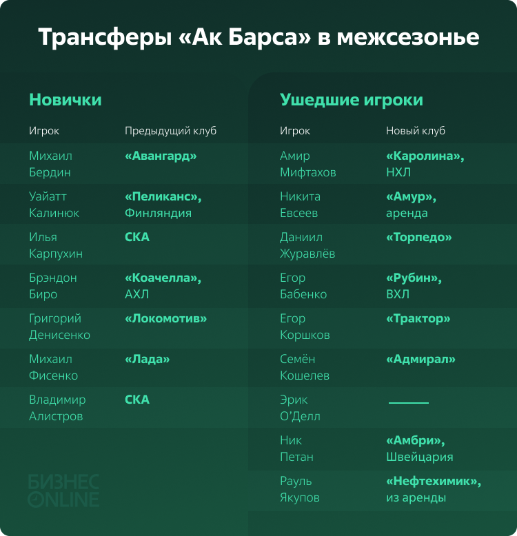 Летом «Ак Барс» покинули семь игроков, но значимыми эти потери назвать нельзя. Ушли нападающие Егор Коршков и Семён Кошелев, которые не оправдали надежд. То же самое касается Ника Петана – ему не предложили новый контракт, в итоге канадец отправился в Швейцарию. Проблемного воспитанника Никиту Евсеева, который сначала жаловался на Зинэтулу Билялетдинова, а теперь и на Гатиятулина, отдали в аренду в «Амур». Другого игрока системы – Даниила Журавлева – обменяли в «Торпедо». Защитник проиграл конкуренцию за место в составе.