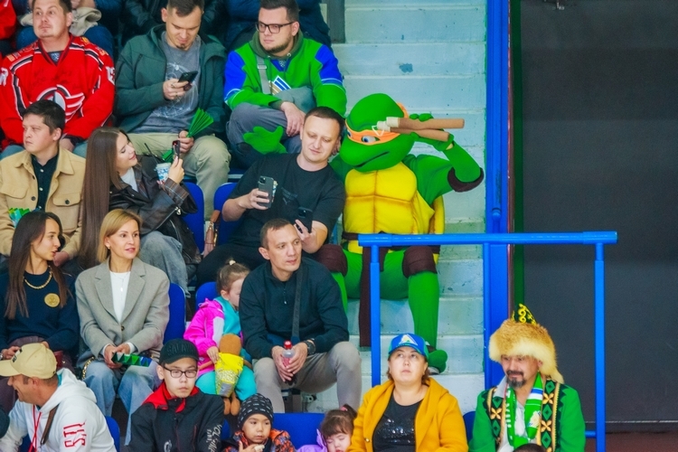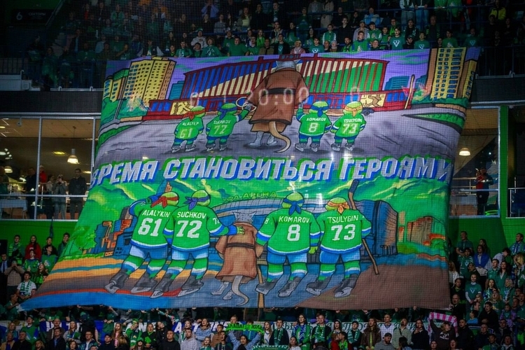 Фан-сектор заранее вывесил баннер, в котором была отсылка к героям мультфильма «Черепашки-ниндзя». На верхней половине стяга показали крысу Сплинтера, который привёл маленьких Данила Алалыкина, Егора Сучкова, Александра Комарова и Ярослава Цулыгина к «Ледовой арене» на улице Рихарда Зорге в Уфе. Там воспитанники уфимского хоккея делают первые шаги в хоккее.
