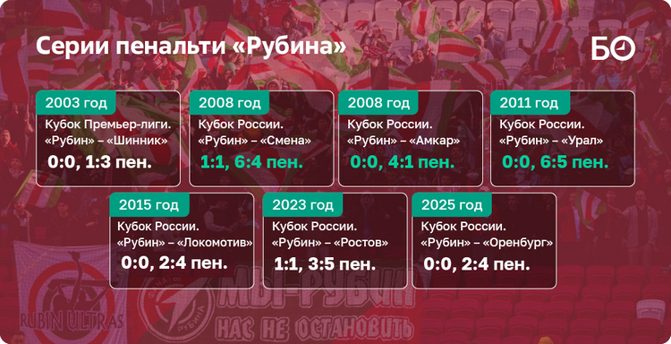Углубляясь в статистику стоит отметить, что «Рубин» не может выйти победителем в серии послематчевых 14 лет! Последний раз казанцы смогли оказаться точнее соперника в июле 2011 года в матче Кубка России против «Урала» (6–5 пен.).