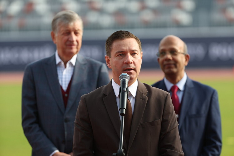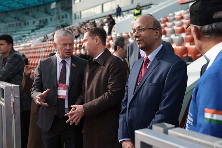 6. Открывать матч пришли министр спорта РТ Владимир Леонов и посол Индии в России Винай Кумар, а также президент Российского союза крикета Игорь Казиков. Интересно, что высокие гости так плотно встали в подтрибунном помещении, что чуть не помешали выходу танцоров на импровизированную сцену.