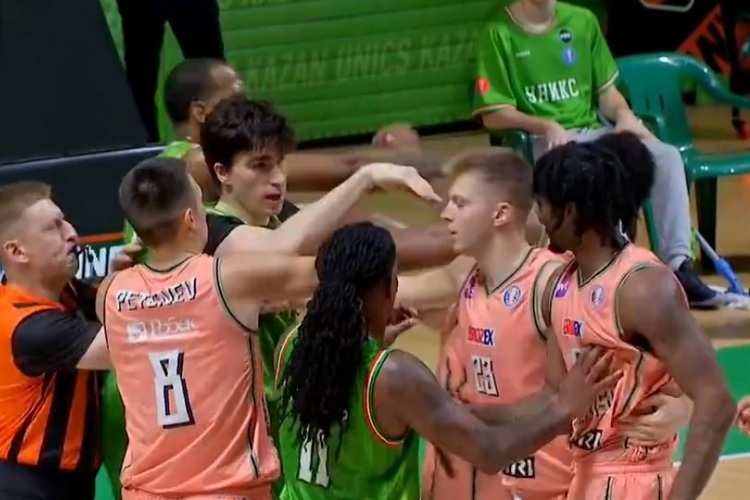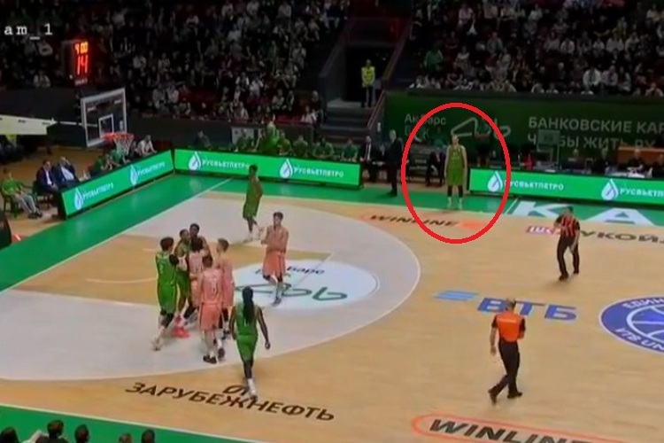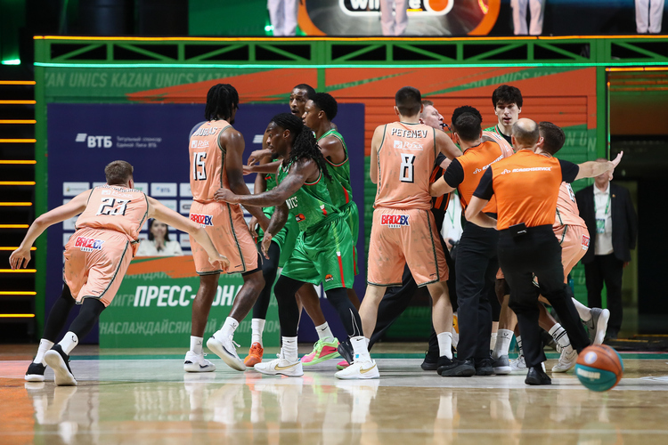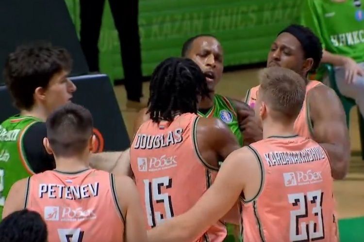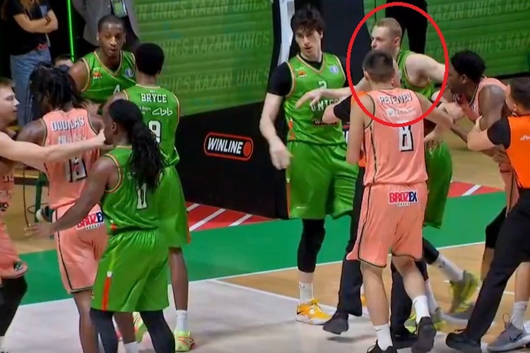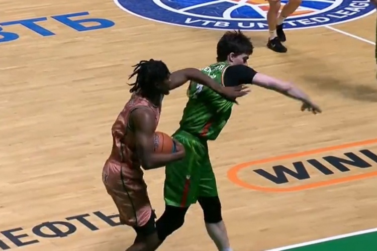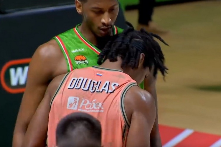 Сначала найдём момент, с которого всё началось. Михаил Беленицкий из УНИКСа взял подбор, но тут у него перехватил мяч Джавонте Даглас. Игроки потолкались и покинули пределы площадки. Несмотря на жёсткую борьбу, Даглас спокойно отдал мяч Беленицкому и ушёл готовиться к защите против очередной атаки УНИКСа.
