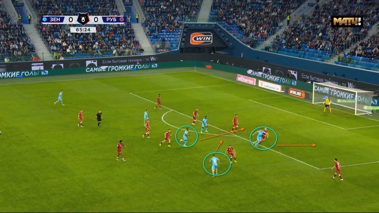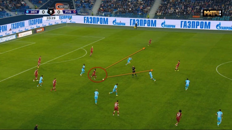 Но вот именно проблема последнего, или даже предпоследнего паса, была в этом матче острой. Порой создавались такие ситуации, в которых казанцы должны нестись вперед, но выбегающему не с кем было перепасоваться или же все слишком сильно разбегались. Вот мяч оказывается у Арройо, он набирает скорость, но вместо того, чтобы отдать мяч Кузяеву, он переводит его на Илью Рожкова, тот поднимается выше, а все зоны уже перекрыты, и пришлось отыгрывать назад. И таких моментов в этой игре хватало.