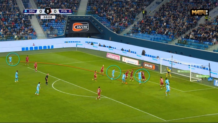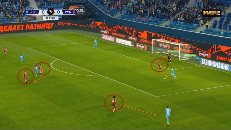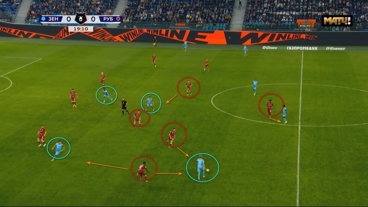 «Рубин» как всегда сделал ставку на дисциплину в обороне и контригру. Хотя с первых минут казанцы применили высокий прессинг, что мешало игрокам «Зенита» быстро начинать атаки. Вот, например, эпизод из первых минут матча. Чумич бежал сначала на вратаря Дениса Адамова, а потом пошел напрягать Нино. В это время Сиве уже был близок к Нуралы Алипу, а Далер Кузяев и Богдан Йочич охраняли Вильмара Барриоса. Хозяевам поля приходилось быстро избавляться от мяча, что приводило к потерям.
