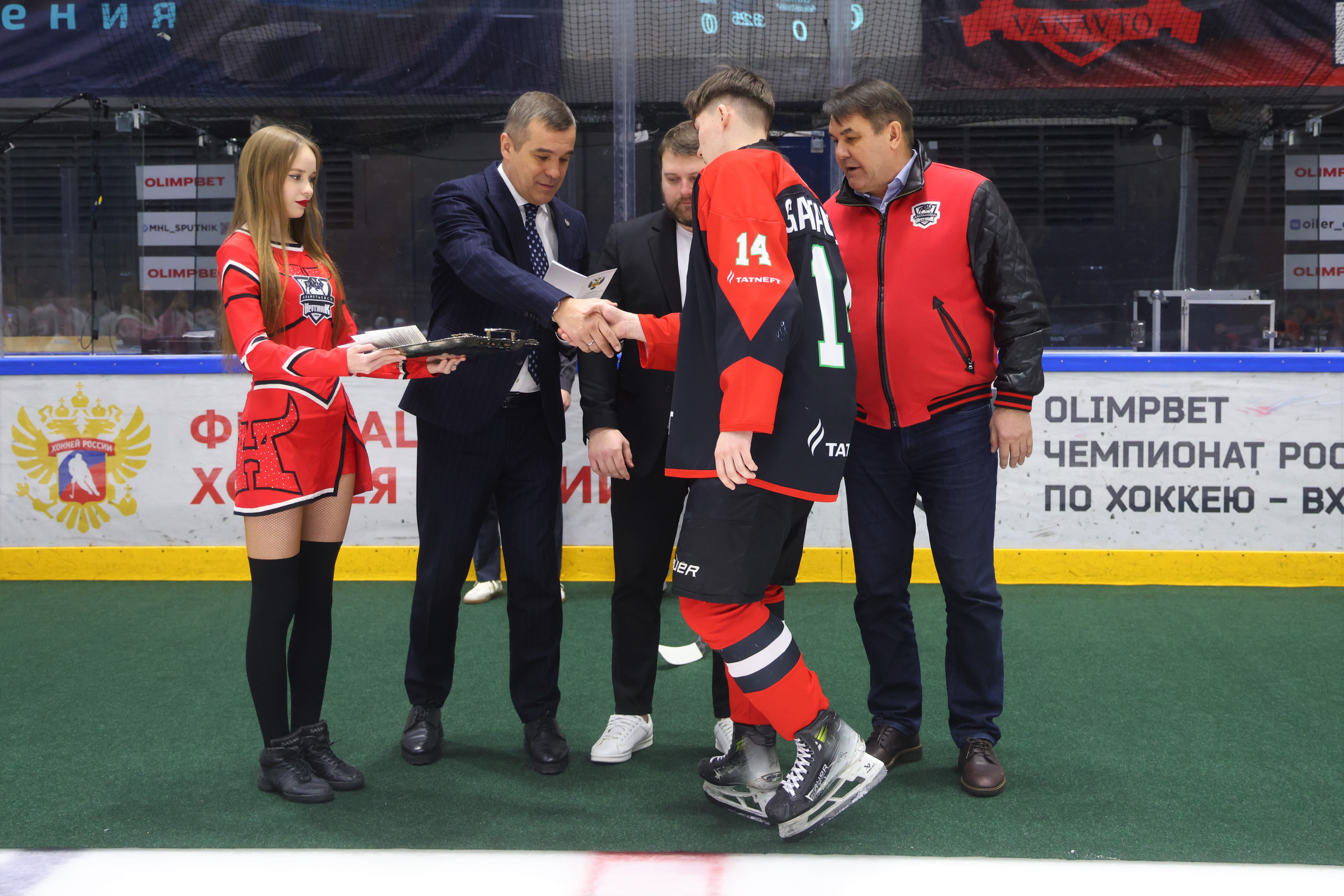 Наградили хоккеистов исполнительный директор «Ак Барса» Мансур Усманов, исполнительный директор «Нефтяника» Рустем Гатин и главный тренер чемпионской команды Андрей Фадеев.