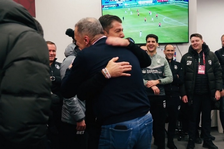 Следом зашёл президент Марат Сафиуллин. «Поздравляю всех с красивой игрой. Сегодня были как одно целое. Так играть... Мы полностью их переиграли!» – сказал Сафиуллин. Перед этими словами он поприветствовал каждого игрока и обнялся к главным тренером Франком Артигой. Всю зиму клуб жил под шквалом критики за увольнение Рахимова и назначение Артиги. В этих объятьях будто благодарность за оправданное доверие.